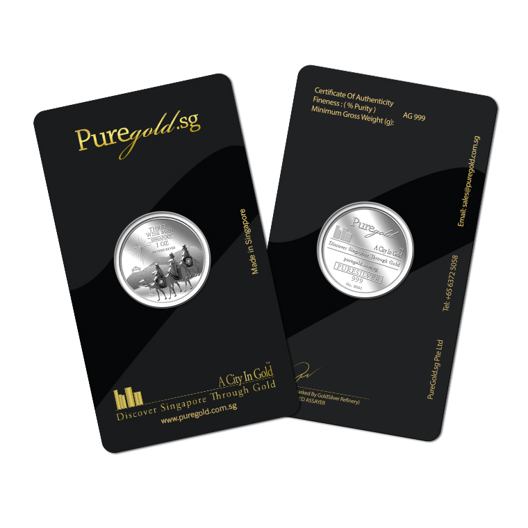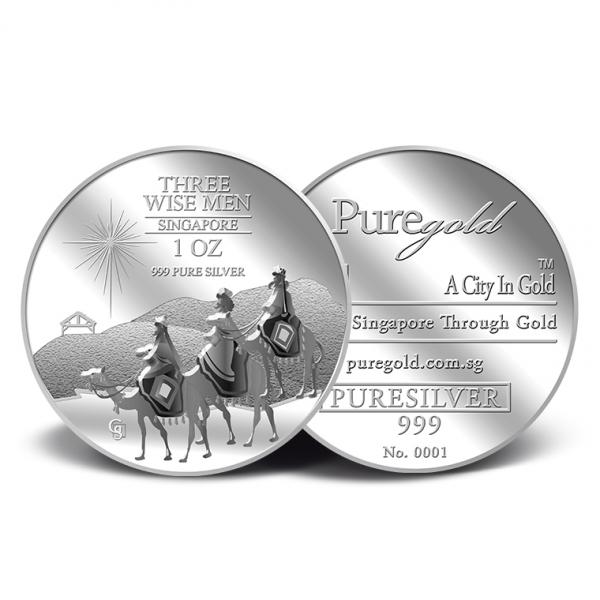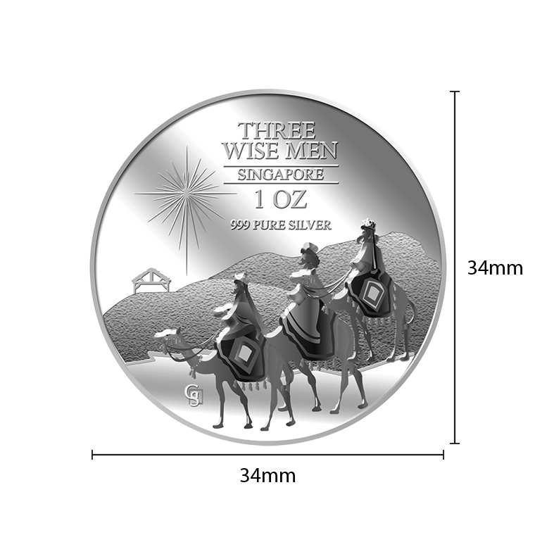 The images of Three Wise Men are embossed on a 1Oz 999 fine silver medallion.