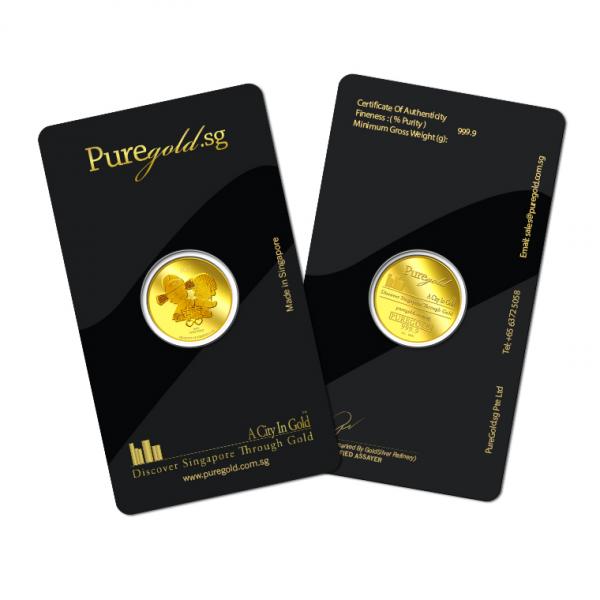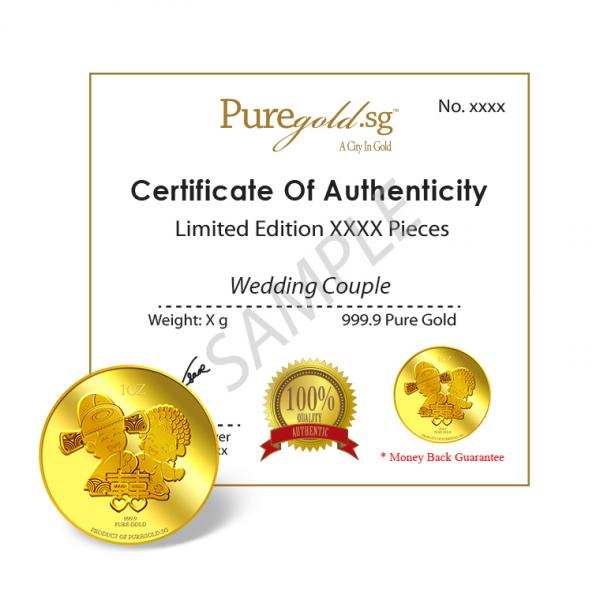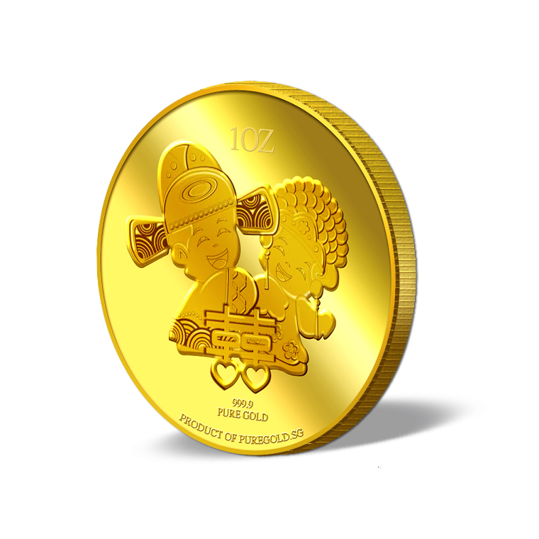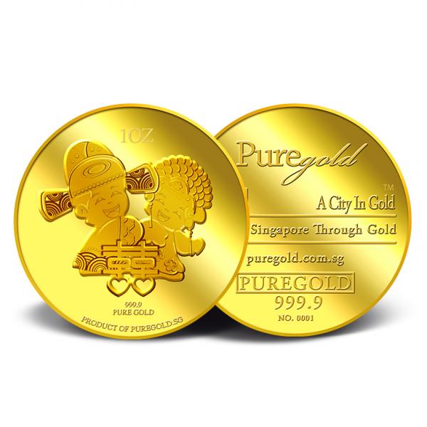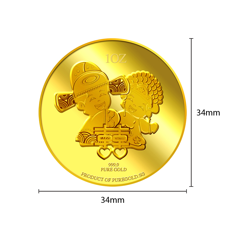 The Double Happiness gold Medallion design portrays a beautiful image a groom and a bride in traditional Chinese wedding costumes, behind the Chinese ligature of “Double Happiness”. The design also includes the inscription PRODUCT OF PUREGOLD.SG, as well as the Medallion’s weight and fineness.