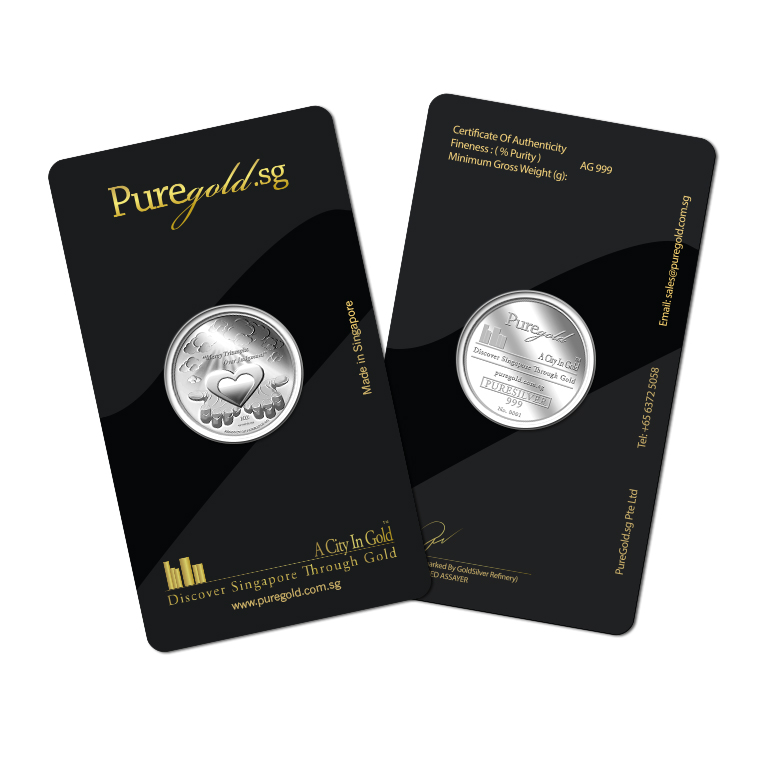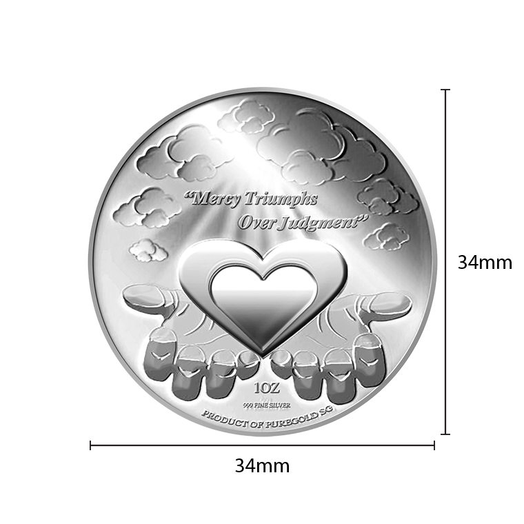 The Mercy Triumphs Over Judgment silver medallion design portrays a beautiful image of a pair of hands holding a heart reaching out from the clouds. The design also includes the inscription “Mercy Triumphs Over Judgment”, PRODUCT OF PUREGOLD.SG and the medallion’s weight and fineness.