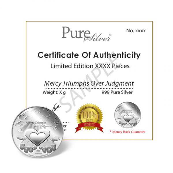 The images of Mercy Triumphs Over Judgment are embossed on a 1Oz 999 fine silver medallion.