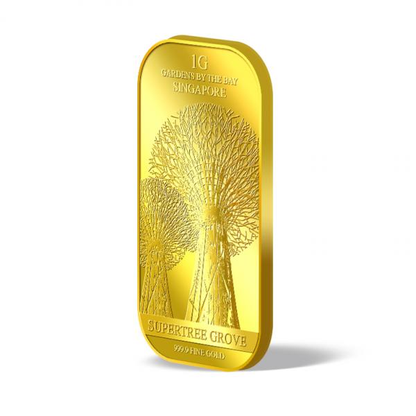 The image of the SuperTree Grove are embossed on a 1g 999.9 fine gold bar.