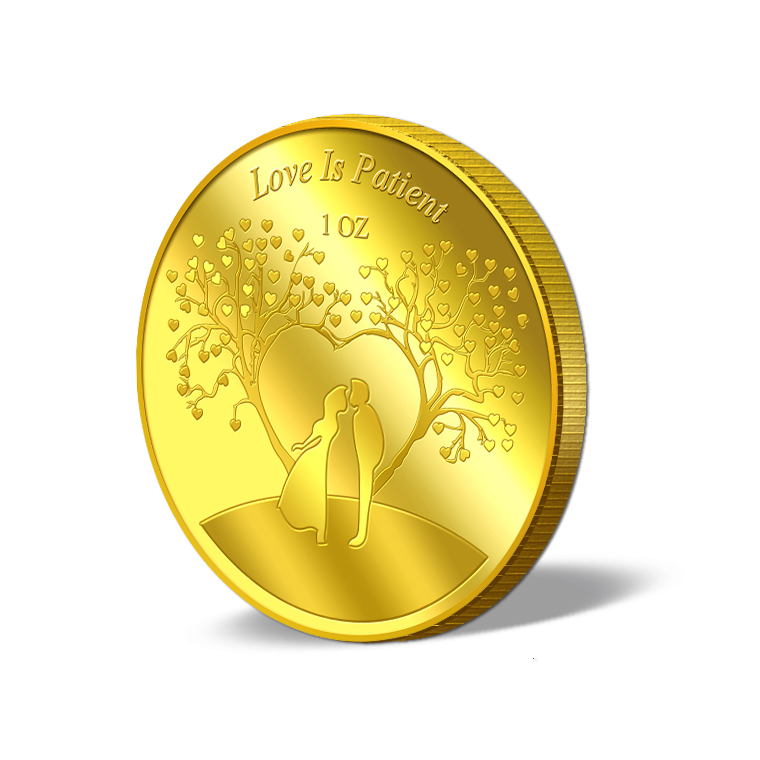 The Love is Patient gold Medallion design portrays a beautiful image a groom and a bride.