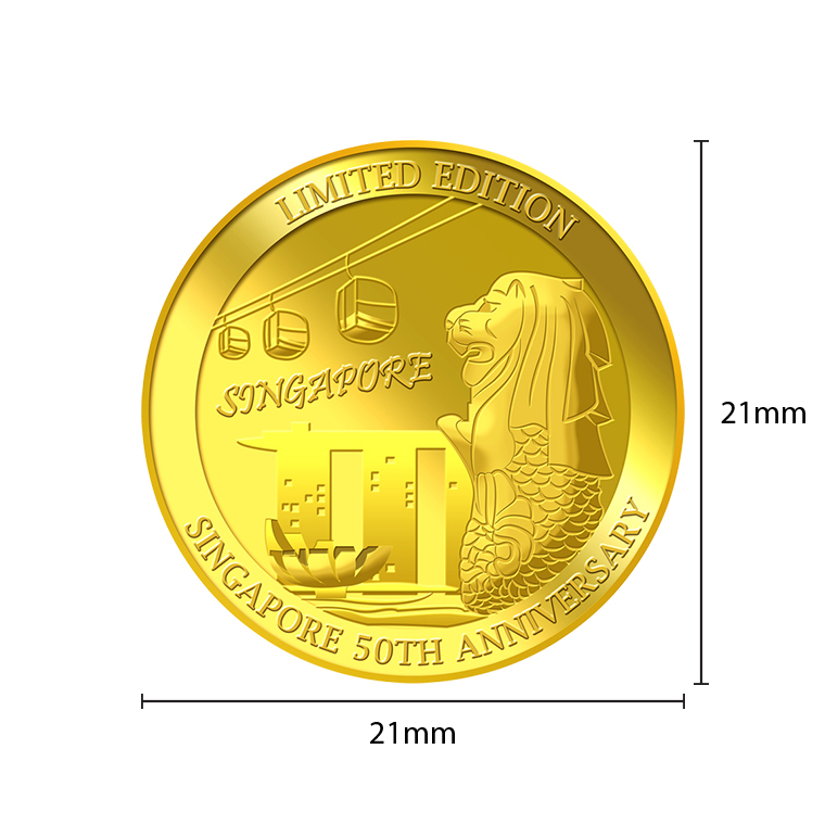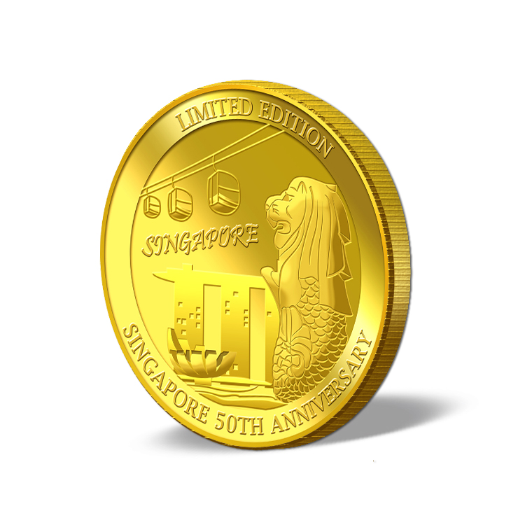 The Limited Edition Singapore 50th Anniversary gold Medallion design portrays Singapore’s national mascot, the Merlion, Singapore Cable Cars and Marina Bay Sands.