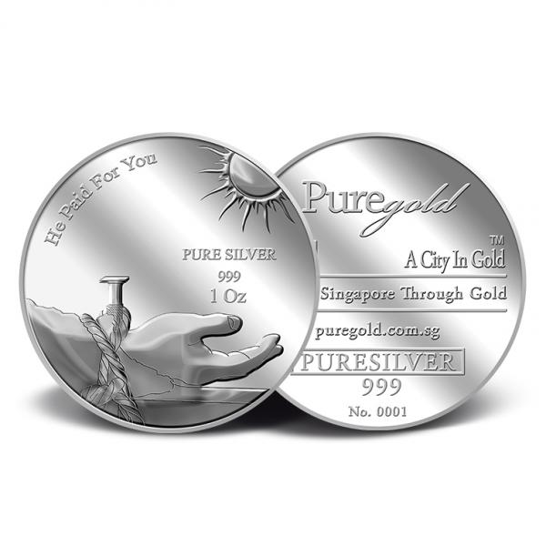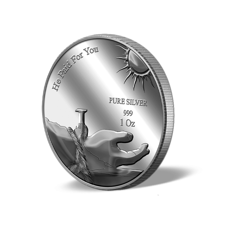 The images of "He Paid For You" are embossed on a 1Oz 999 fine silver medallion.