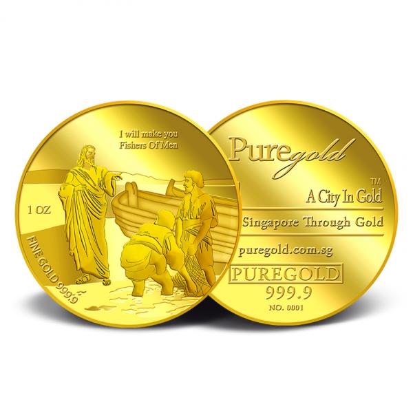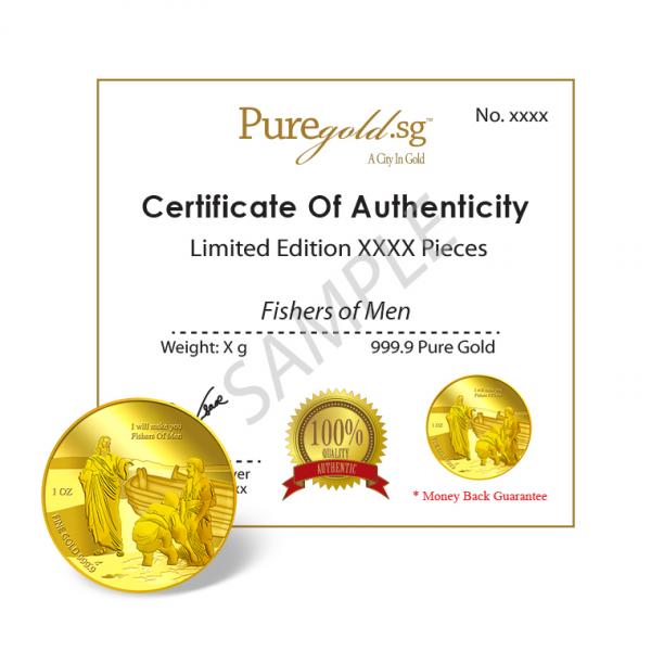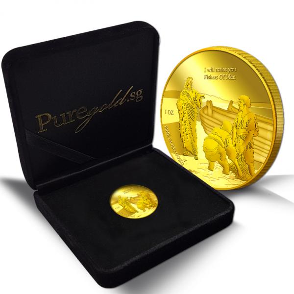 The images of "I Will Make You Fishers of Men" are embossed on a 1oz 999.9 fine gold Medallion.