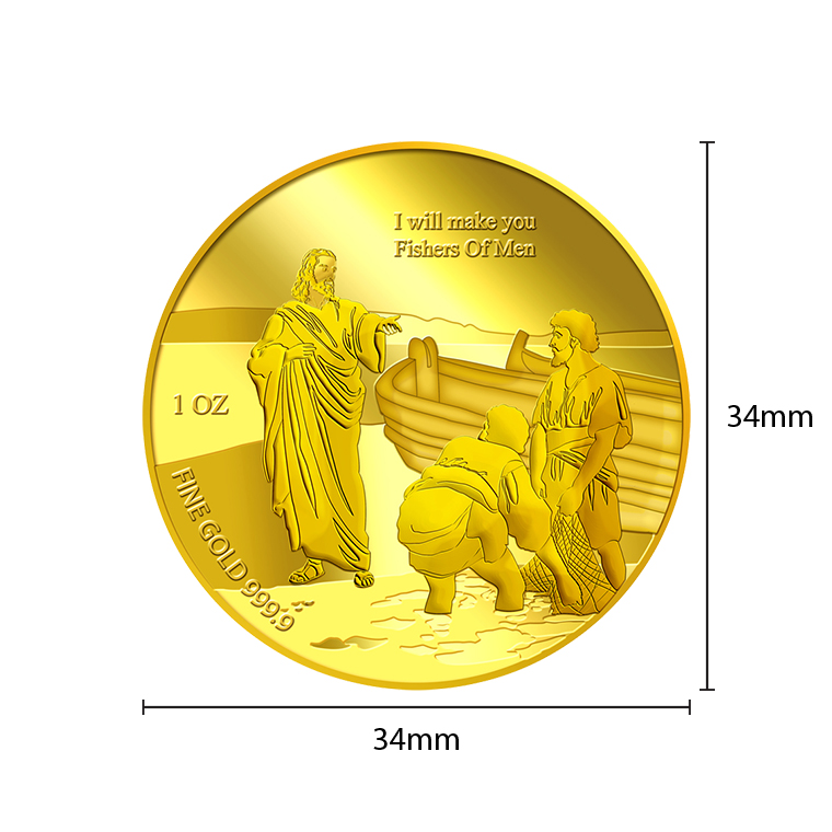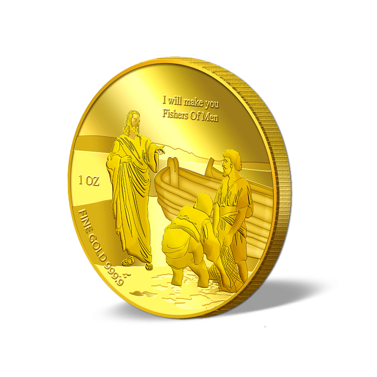 The "I Will Make You Fishers of Men" gold Medallion design portrays an image of Jesus and the two brothers, Peter and Andrew at Sea of Galilee by a boat. The design also includes the inscription”I Will Make You Fishers of Men", the Medallion’s weight and fineness.