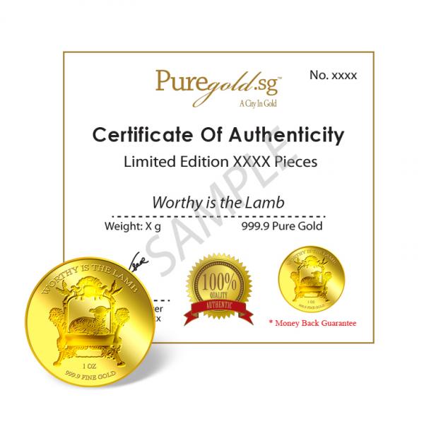 The images of "Worthy is the Lamb" are embossed on a 1oz 999.9 fine gold Medallion.