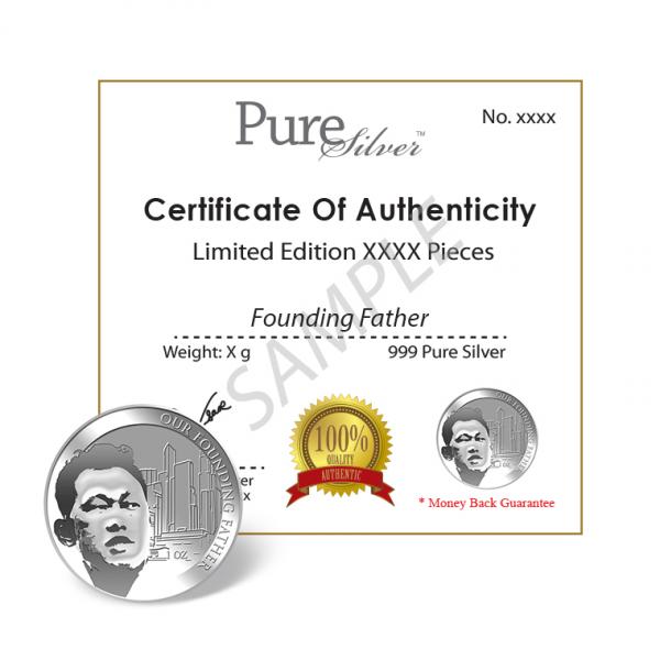 The 'Our Founding Father' silver medallion design portrays an image of our Founding Father with outline of buildings as the background. The design also includes the inscription “OUR FOUNDING FATHER" and the medallion’s weight.