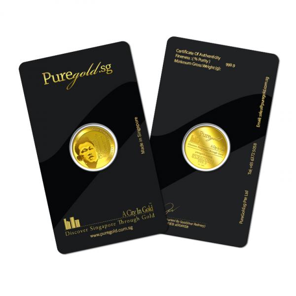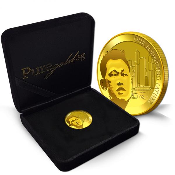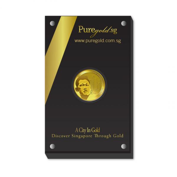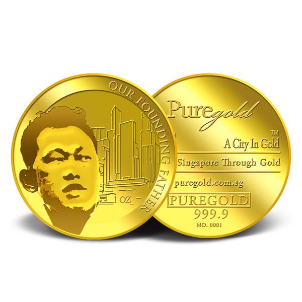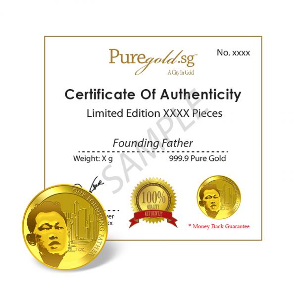 The 'Our Founding Father' gold Medallion design portrays an image of our Founding Father with outline of buildings as the background. The design also includes the inscription “OUR FOUNDING FATHER" and the Medallion’s weight.