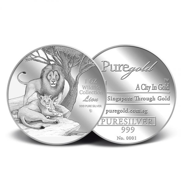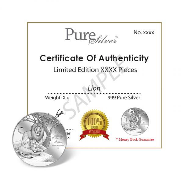 The image of a lion and a lioness is embossed on a 1Oz 999 fine silver medallion.