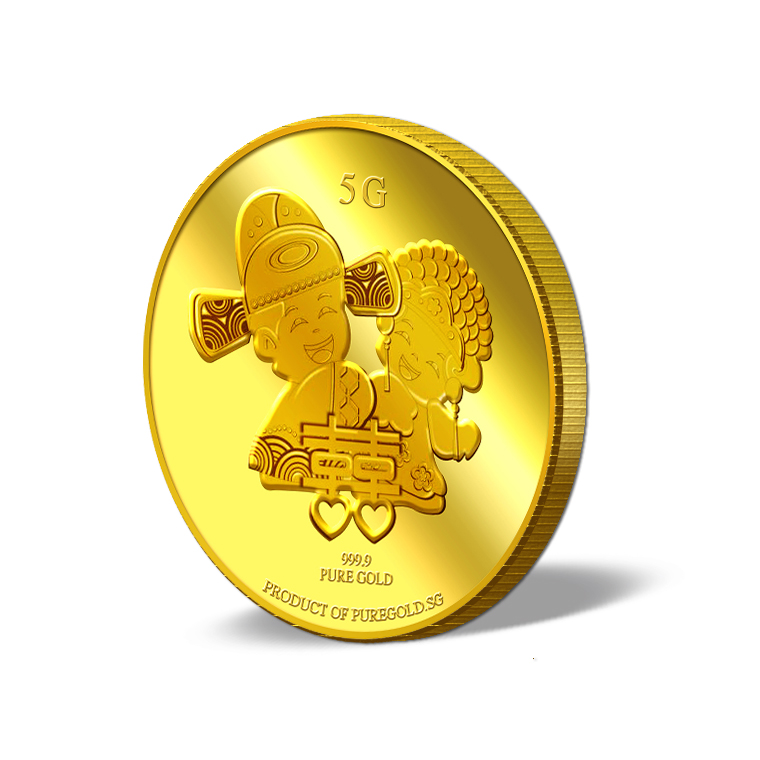 The Double Happiness gold Medallion design portrays a beautiful image a groom and a bride in traditional Chinese wedding costumes, behind the Chinese ligature of “Double Happiness”. The design also includes the inscription PRODUCT OF PUREGOLD.SG, as well as the Medallion’s weight and fineness.