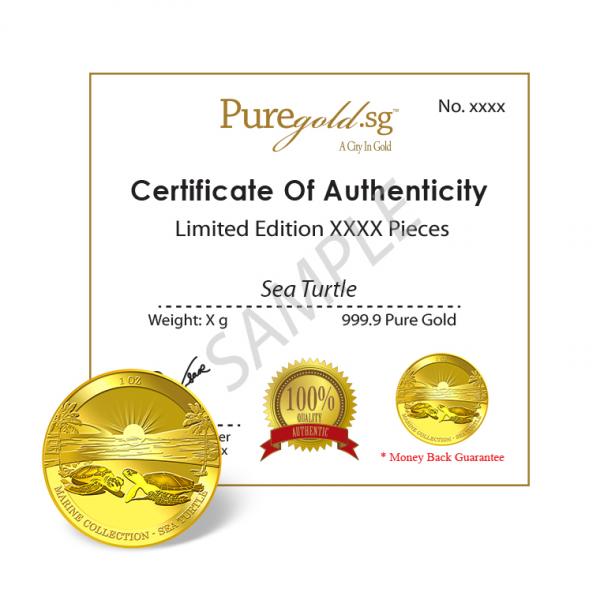 The image of the two sea turtles is embossed on a 1oz 999.9 fine gold.