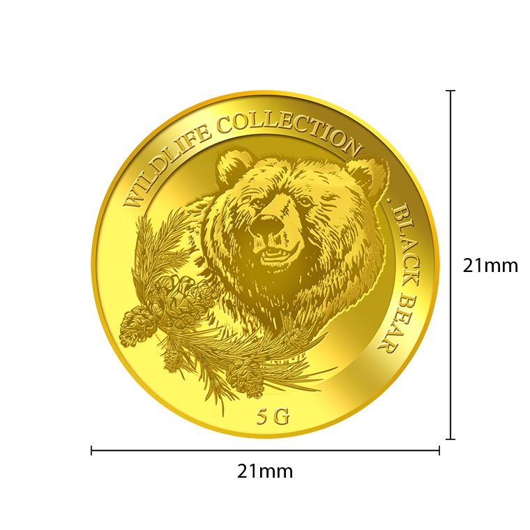 The image of an emerging black bear is embossed on a 5g 999.9 fine gold.