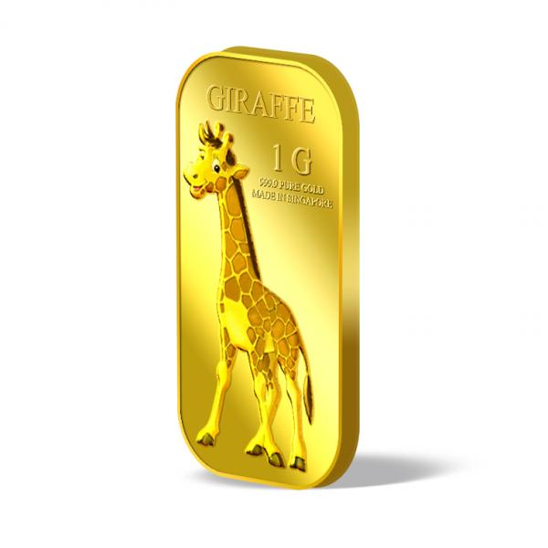 The image of a male giraffe is embossed on a 1g 999.9 fine gold bar.