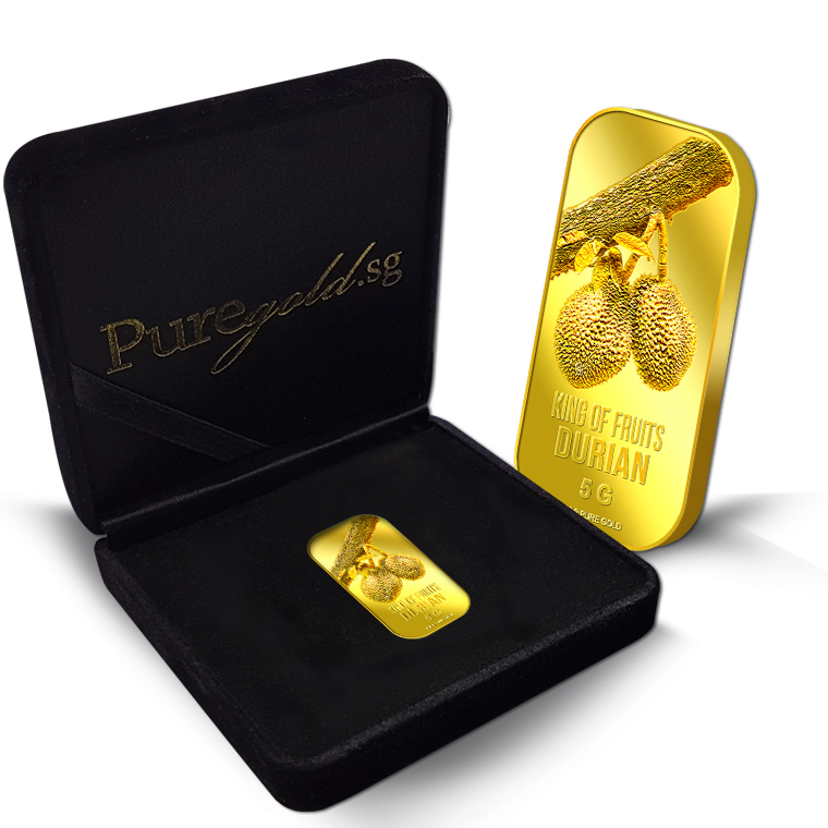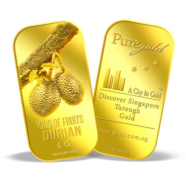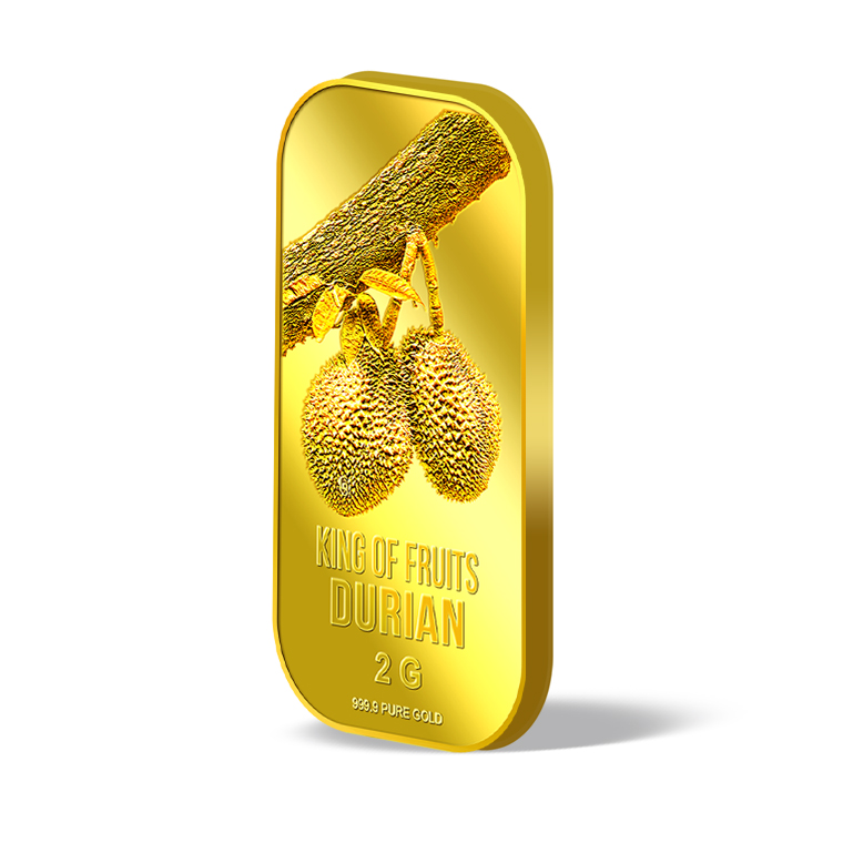 The image of the durian is embossed on a 5g 999.9 fine gold bar.