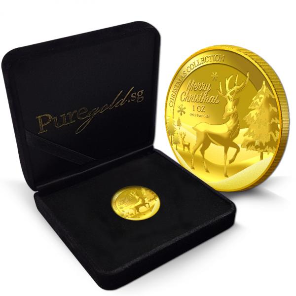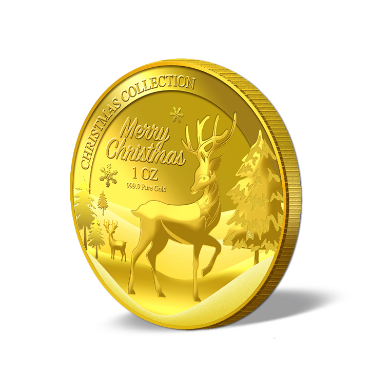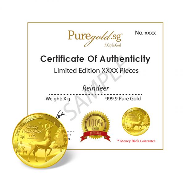 The image of Reindeer and the Snow is embossed on a 1oz 999.9 fine gold Medallion.