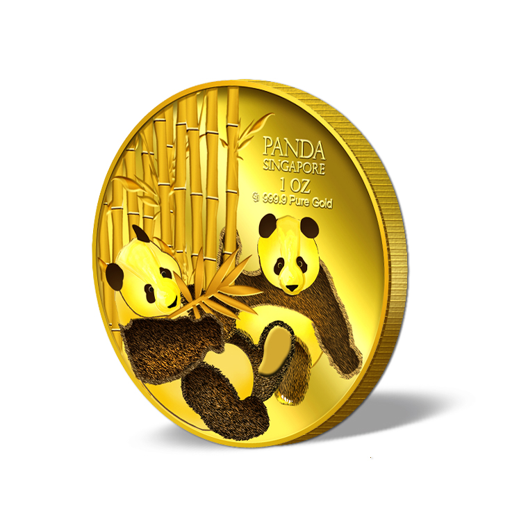 The Giant Pandas gold Medallion design portrays two giant pandas resting by a cluster of bamboo plants, which are the main food source of giant pandas. The design also includes the inscription PANDA SINGAPORE, the Medallion’s weight and fineness, and GoldSilver Refinery’s “GS” logo mark.