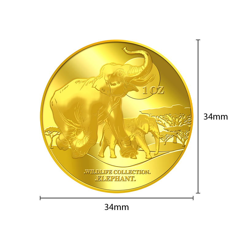 The Elephant gold Medallion design portrays an image of an Elephant. The design also includes the inscription WILDLIFE COLLECTION, ELEPHANT, the Medallion’s weight and fineness.