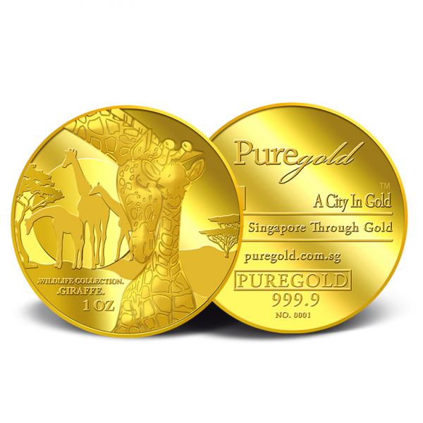 The image of a giraffe and its calf is embossed on a 1oz 999.9 fine gold.