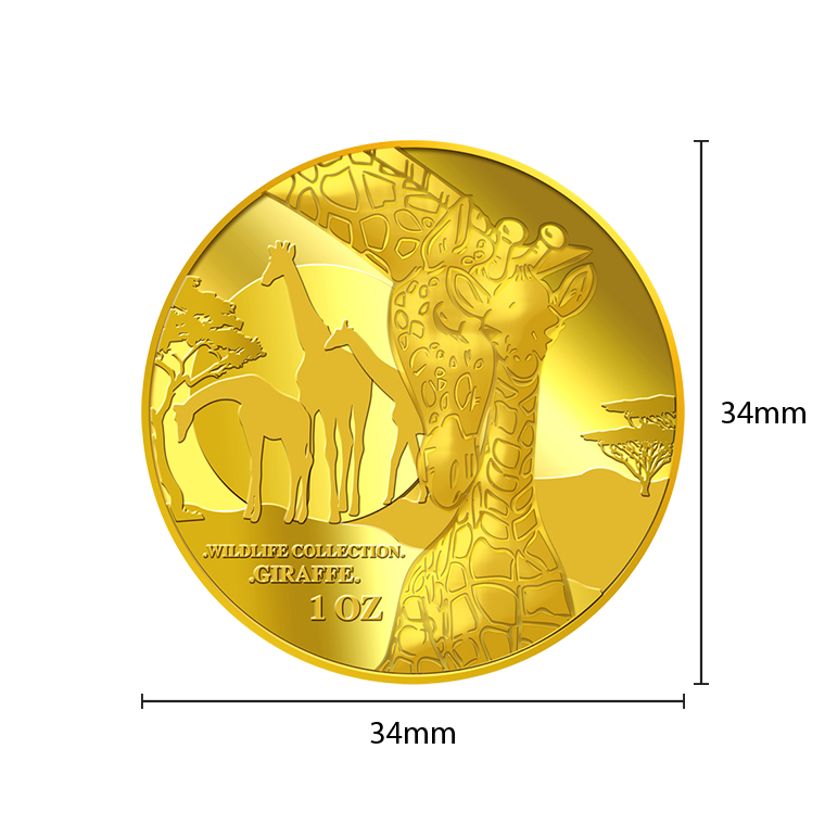 The Giraffe gold Medallion design portrays an image of a giraffe showing affection to its calf. The design also includes the inscription WILDLIFE COLLECTION, GIRAFFE and the Medallion’s weight.