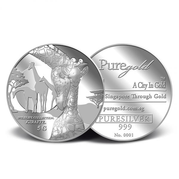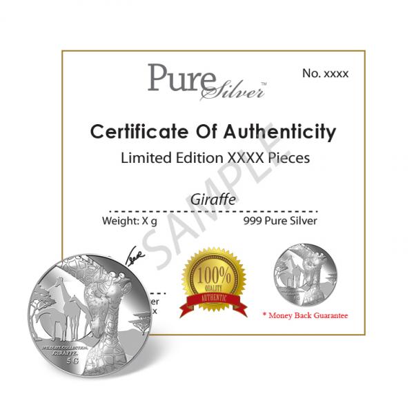 The image of a giraffe and its calf is embossed on a 5g 999 fine silver.
