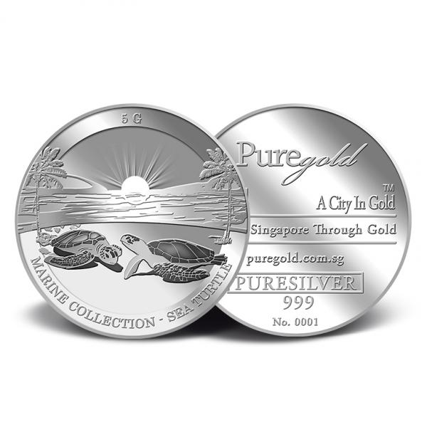 The image of the two sea turtles is embossed on a 5g 999 fine silver medallion.