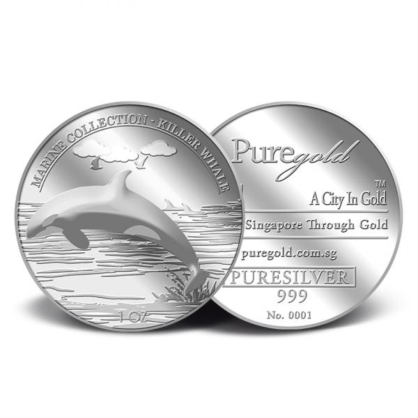 The 1Oz Killer Whale medallion design portrays an image of Killer Whale. The design also includes the inscription MARINE COLLECTION, the medallion’s weight and fineness, and GoldSilver Refinery’s “GS” logo mark.