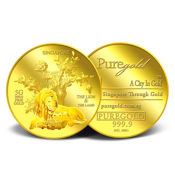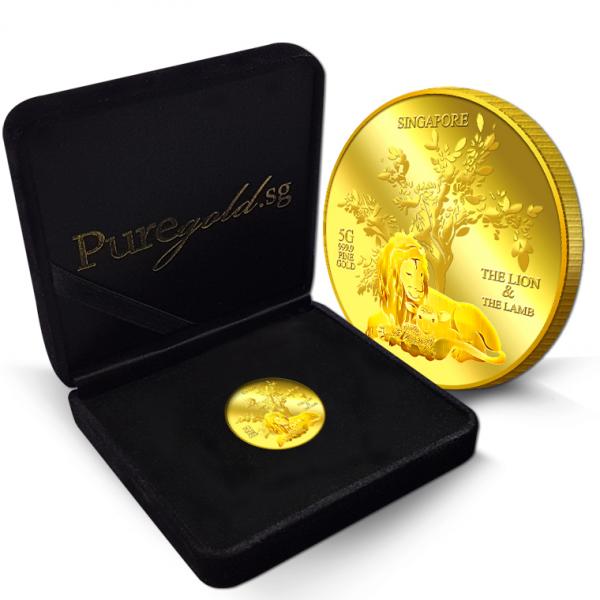 The images of The Lion & The Lamb are embossed on a 5g 999.9 fine gold medallion.