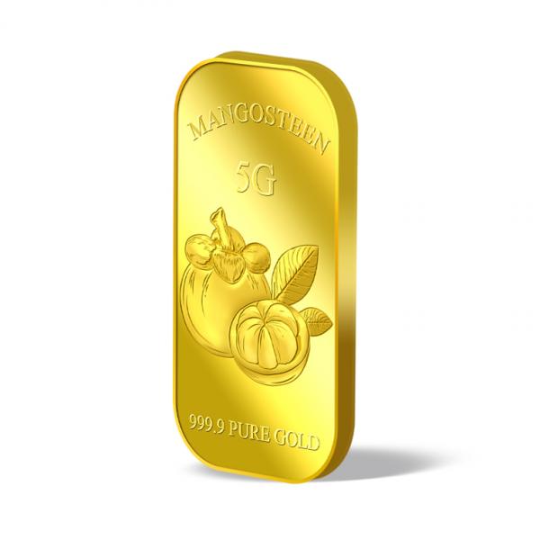 The image of the mangosteen is embossed on a 5g 999.9 fine gold bar.