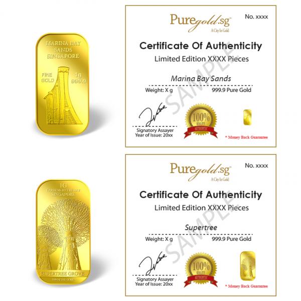 1g gold bar embossed with the image of Marina Bay Sands. Item will be sent to the Singapore Assay Office (SOA) for assaying once the order is received. Item will be delivered within 3 working days after it is hallmarked.
