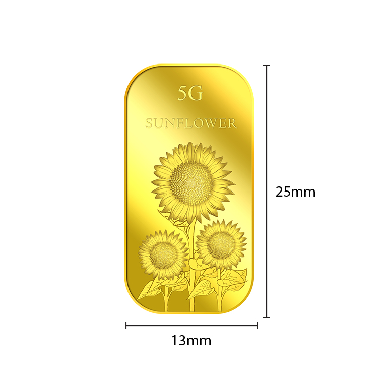 The image of the Sunflower is embossed on a 5g 999.9 fine gold bar.