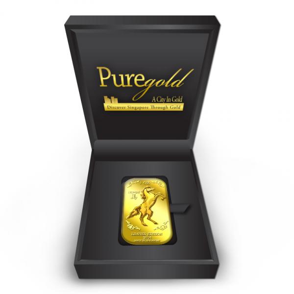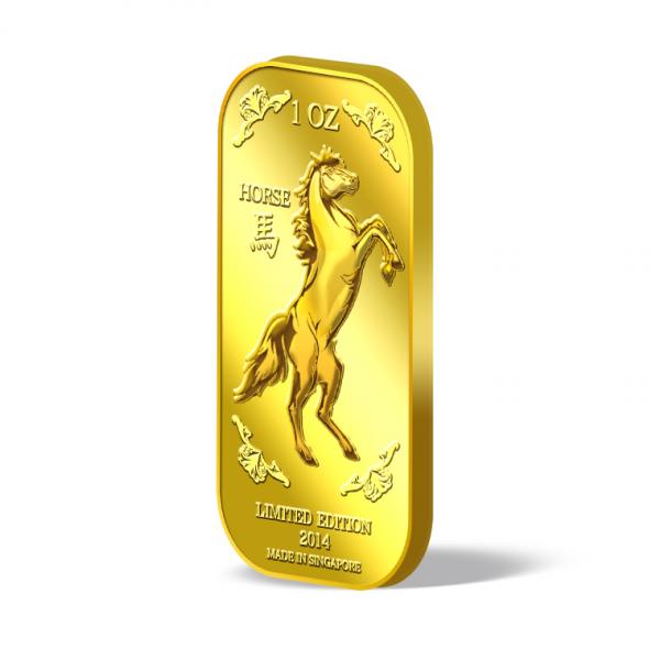The image is embossed on a 1 troy oz 999.9 fine gold bar.