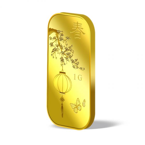 The image is embossed on a 1 gram 999.9 fine gold bar.