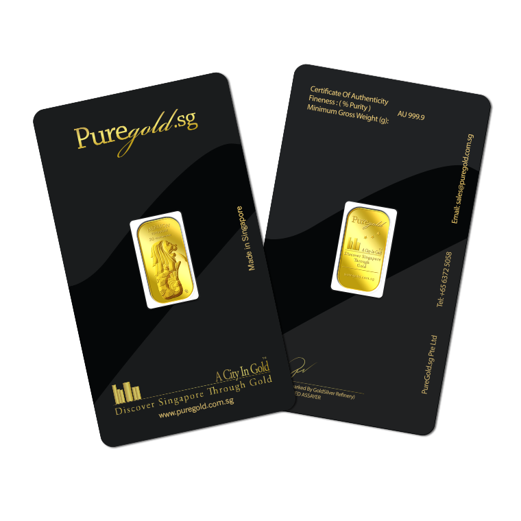 The new version of the Singapore Merlion gold bar design portrays Singapore’s national mascot, the Merlion, as a fountain with water gushing out from its mouth. The design also includes the inscription SINGAPORE «MERLION, the Medallion’s weight and fineness, and PureGold webpage address.