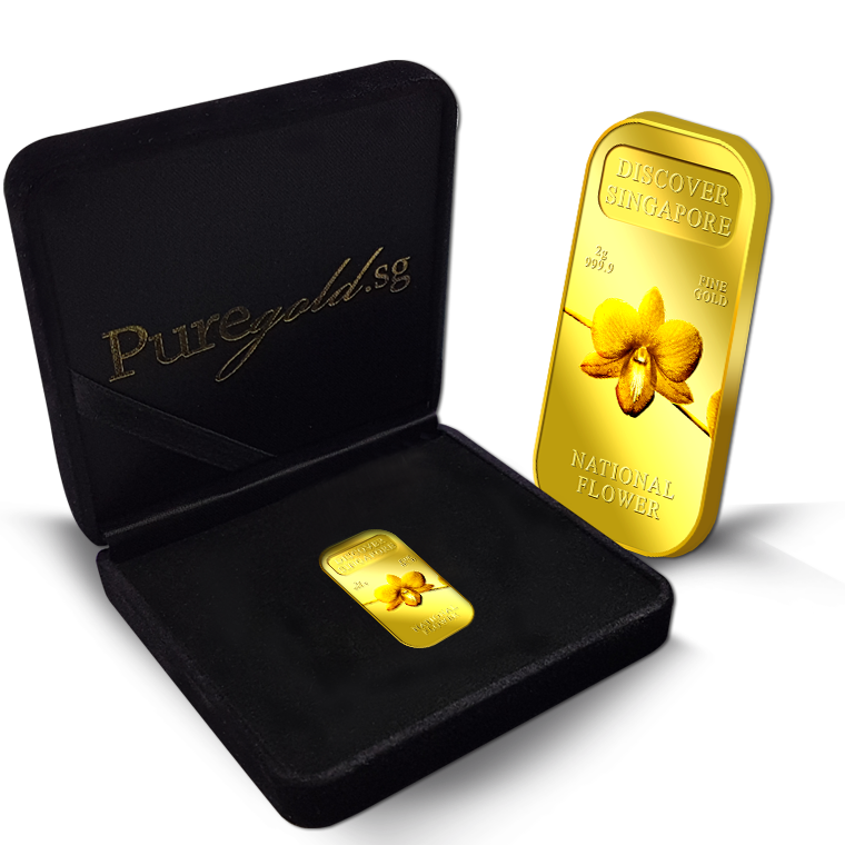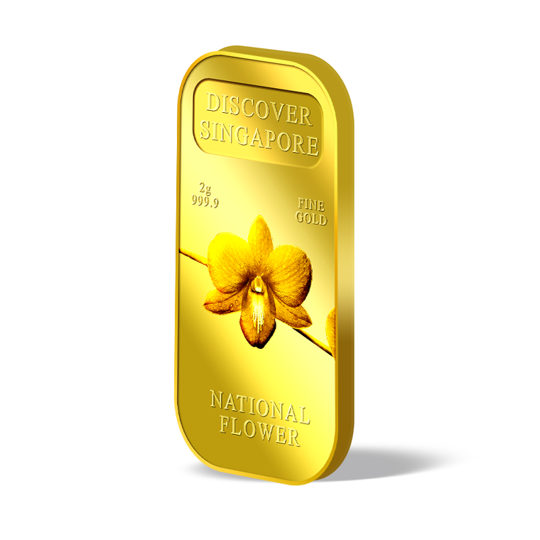 The image of Singapore’s national flower, Vanda Miss Joaquim Orchid, is embossed on a 5g 999.9 fine gold bar.
