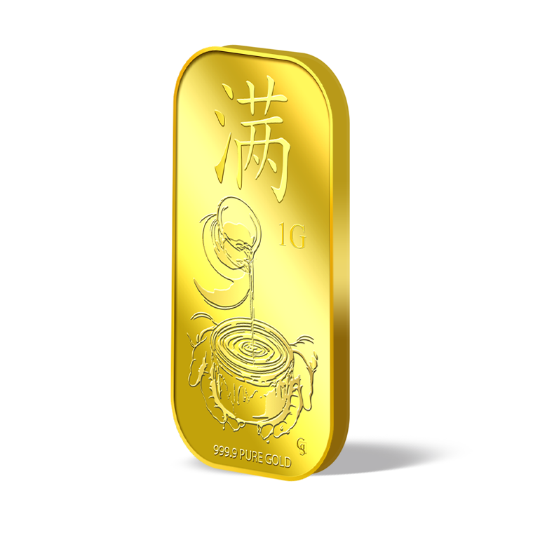 The image is embossed on a 1 gram 999.9 fine gold bar.