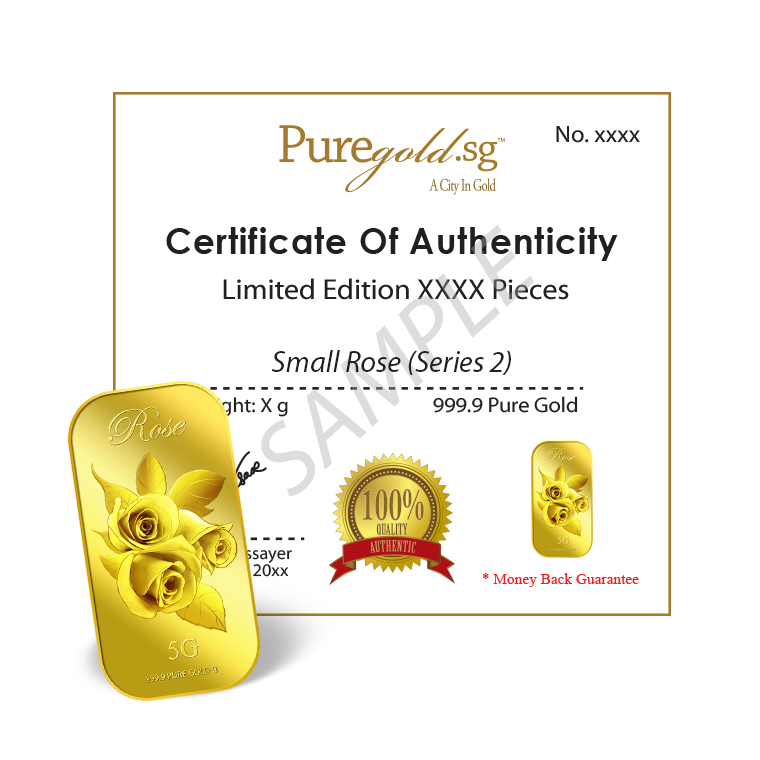In this uniquely designed gold bar, the big single gold rose with leaves represents joy, gladness, friendship and hope, making this gold bar a perfect gift for loved ones or close friends to show them that we rejoice in their happiness.