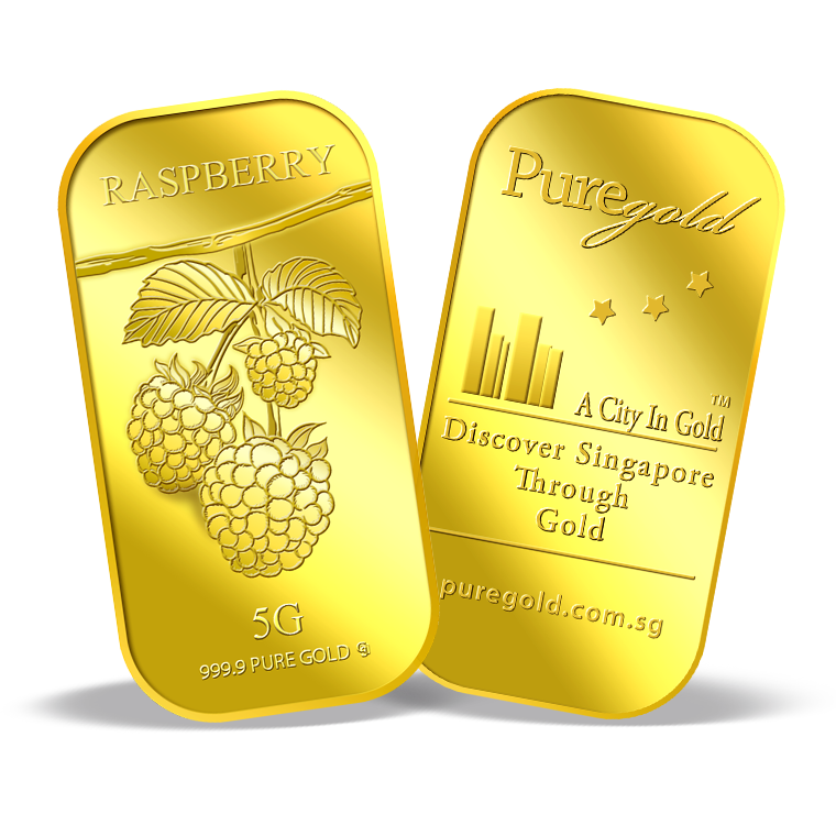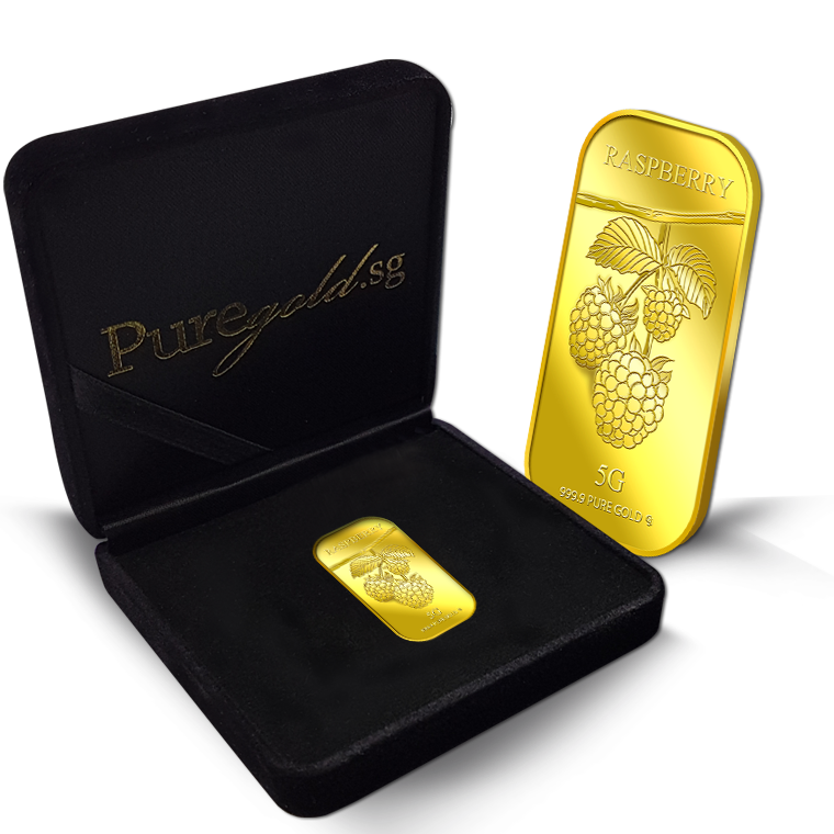 The image is embossed on a 5 grams 999.9 fine gold bar.