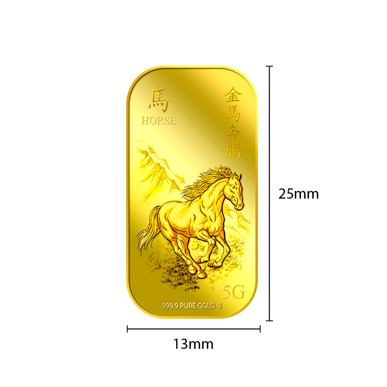 The image is embossed on a 5 grams 999.9 fine gold bar.