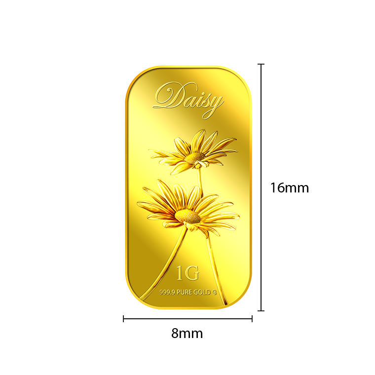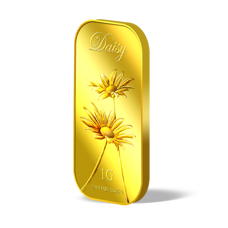 The image is embossed on a 1 gram 999.9 fine gold bar.