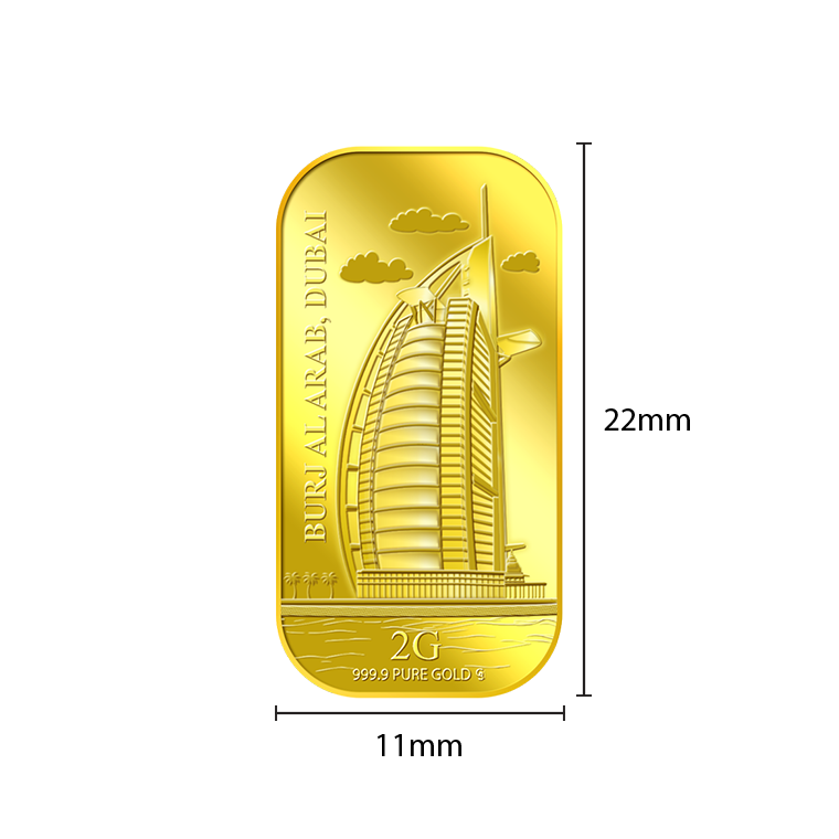 The image is embossed on a 2 grams 999.9 fine gold bar.
