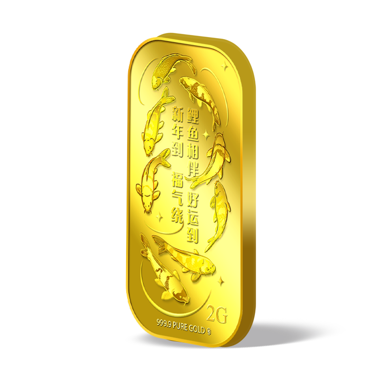 The image is embossed on a 2 grams 999.9 fine gold bar.