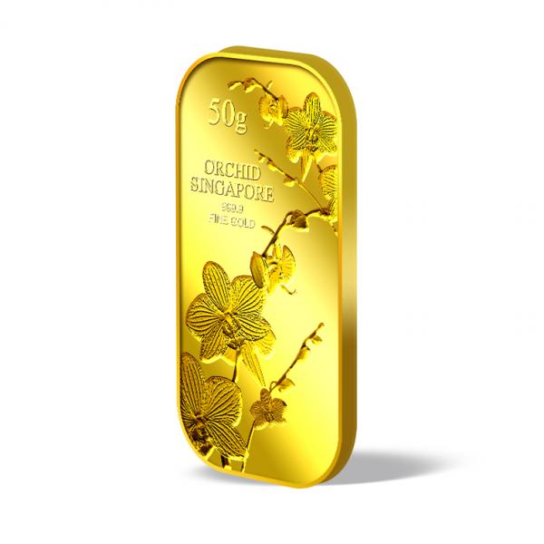 50g gold bar embossed with the image of Singapore national flower, the Vanda (Miss Joaquim).