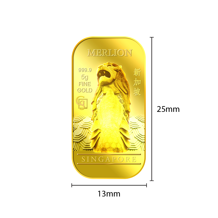 The 5g Merlion gold bar design portrays an image of a Merlion. The design also includes the inscription MERLION, SINGAPORE, the Medallion’s weight and fineness, and GoldSilver Refinery’s “GS” logo mark.