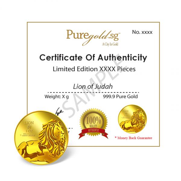 The images of Lion of Judah are embossed on a 1oz 999.9 fine gold Medallion.