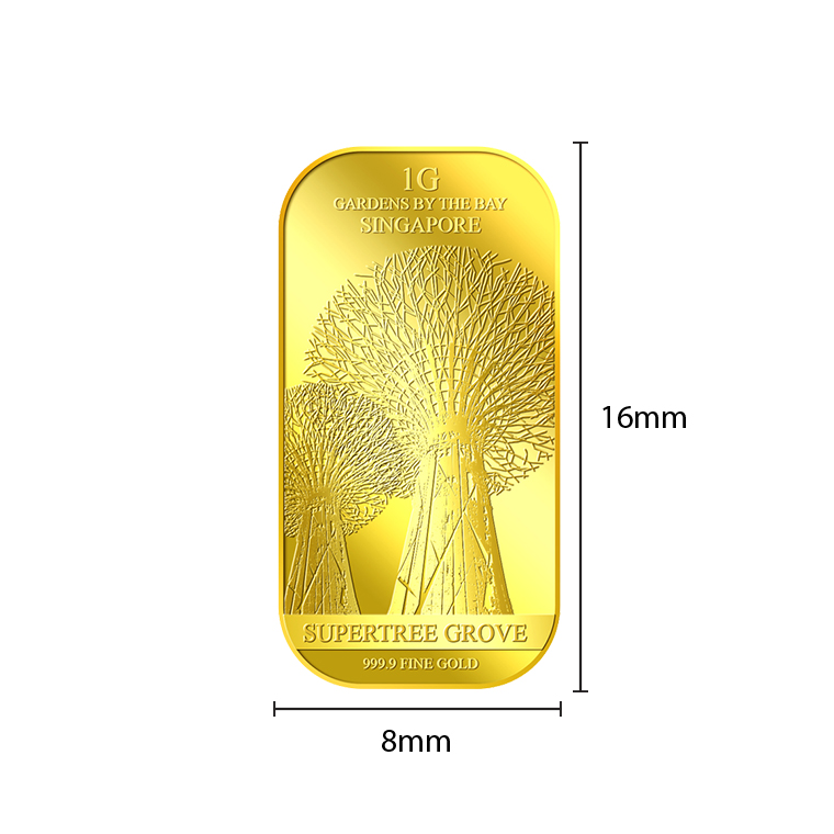 The image of the SuperTree Grove are embossed on a 1g 999.9 fine gold bar.