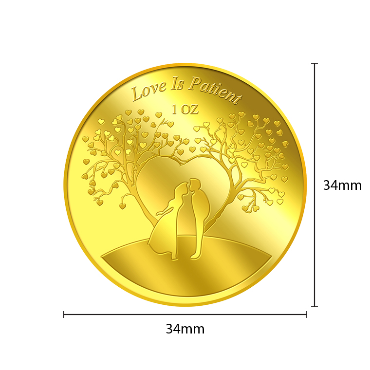 The Love is Patient gold Medallion design portrays a beautiful image a groom and a bride.