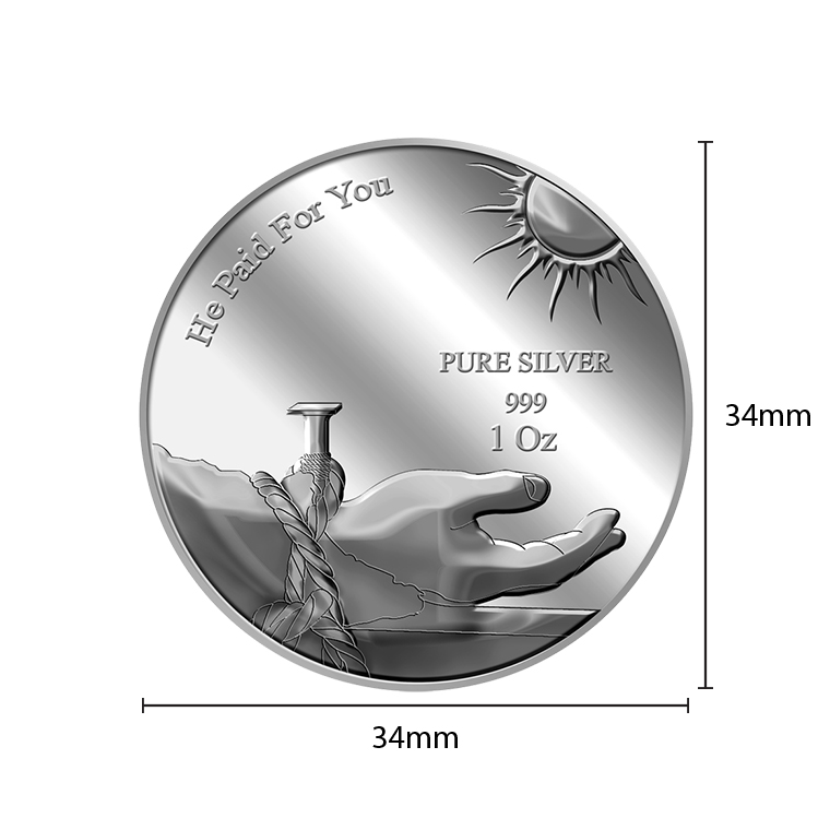 The images of "He Paid For You" are embossed on a 1Oz 999 fine silver medallion.