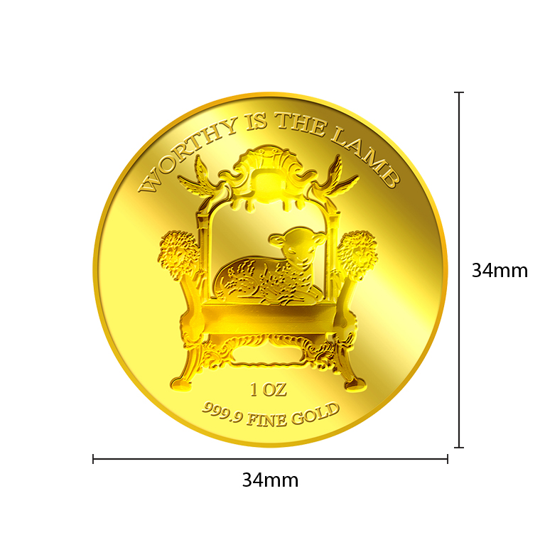 The "Worthy is the Lamb" gold Medallion design portrays an image of a lamb on a throne. The design also includes the inscription “Worthy is the Lamb", the Medallion’s weight and fineness.