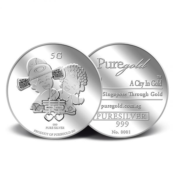 The Double Happiness gold medallion design portrays a beautiful image a groom and a bride in traditional Chinese wedding costumes, behind the Chinese ligature of “Double Happiness”. The design also includes the inscription PRODUCT OF PUREGOLD.SG, as well as the medallion’s weight and fineness.